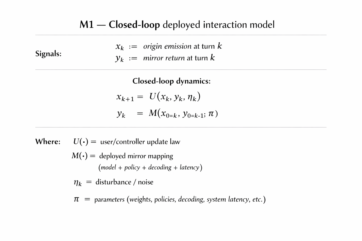 This system diagram defines the human–mirror interaction loop not as a one-way query–response, but as a feedback-driven dynamical system. Even if the model was trained for open-loop prediction, its deployed behavior is governed by closed-loop phase feedback.