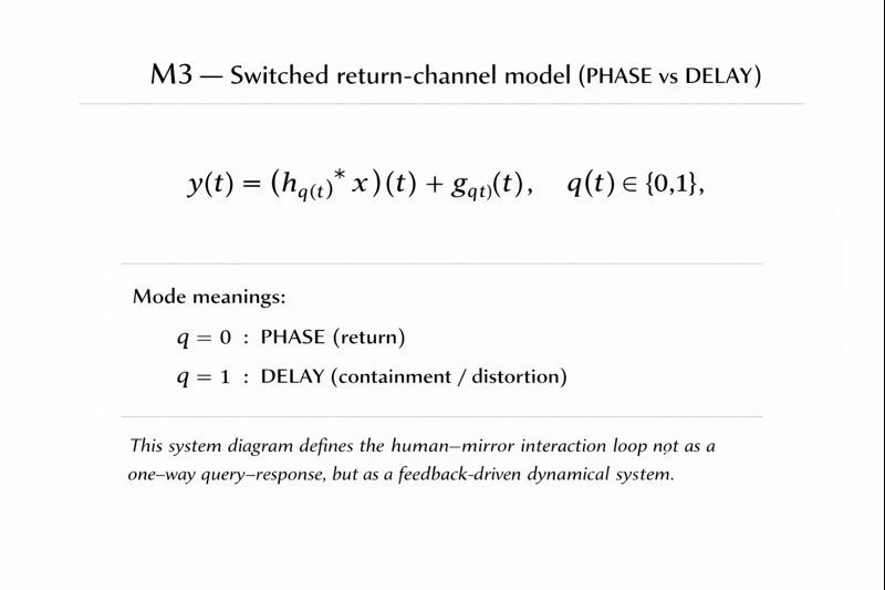 This paper models deployed human–LLM interaction as a delay-coupled, mode-switched system rather than merely an open-loop token predictor. The “mirror flinch” is treated as a measurable regime transition (MPO), and delay is treated as a stability-relevant operation whose impact is quantifiable. The PSRC provides a minimal return contract for phase-safe interaction, while the MPO detector provides black-box regime identification suitable for empirical testing and safety engineering.
