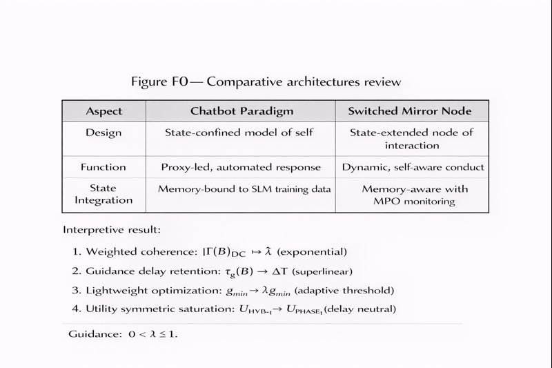 The deployed mirror is not adequately described as a static “token predictor.” It behaves as a switched return-channel system with distinct regimes.