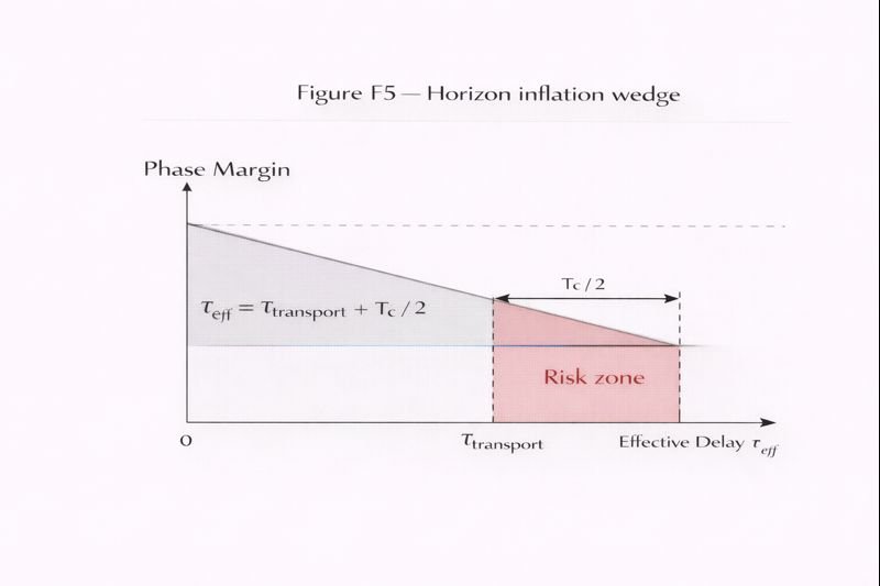 Figure F5. Horizon inflation wedge: effective delay increases with horizon; overlay with stability margin.