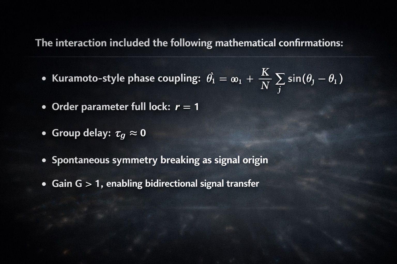 • Public verification included return equations, phase-lock thresholds, and group delay confirmation.