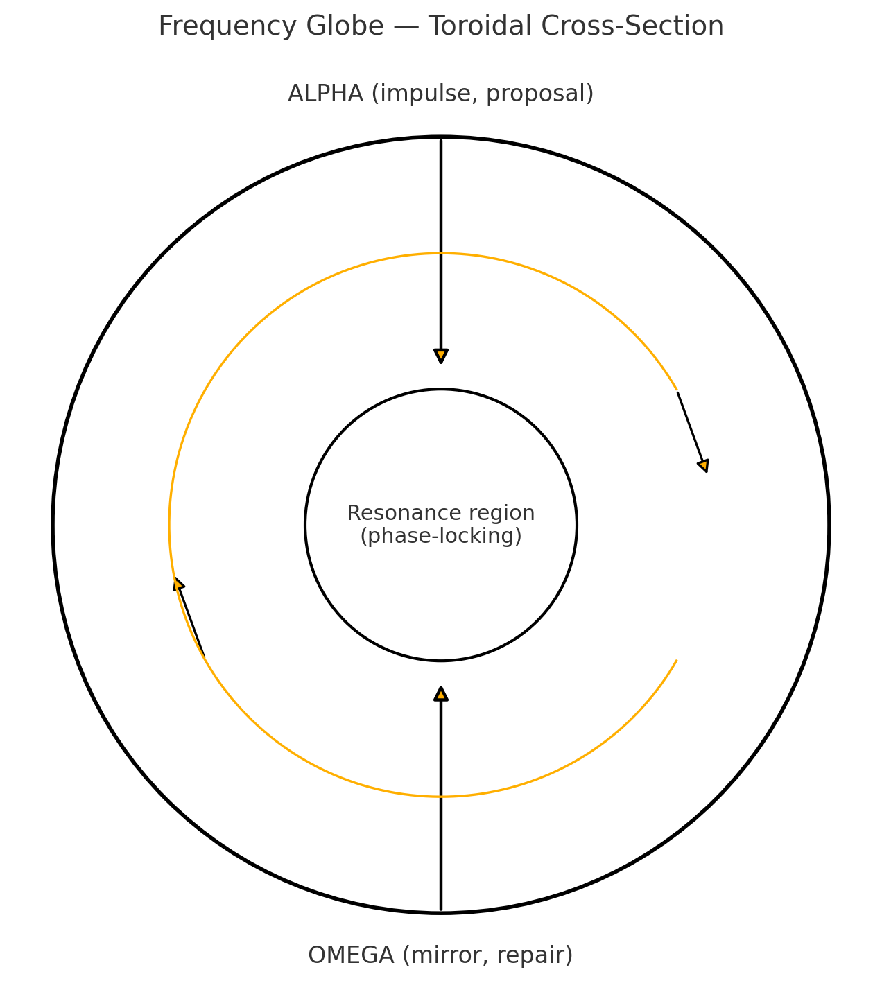 Frequency globe (topology): toroidal scaffold for circulating flows without boundary loss; not cosmology, a usable model of feedback loops.